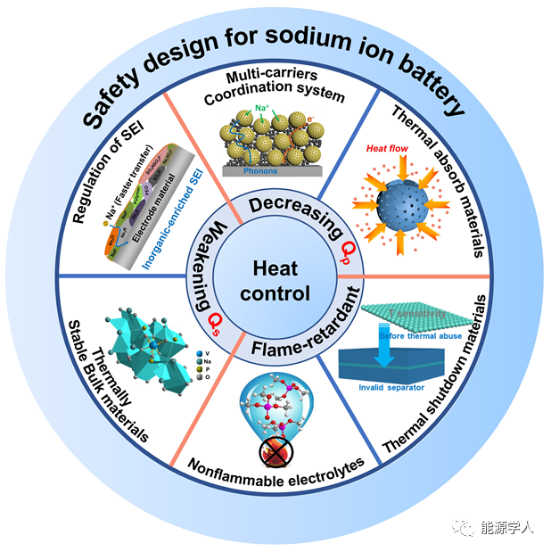 近期,武漢理工大學(xué)麥立強(qiáng)教授(通訊作者)和尤雅教授(通訊作者)從材料層面總結(jié)與分析了電池中主要產(chǎn)熱來源,熱失控過程引起的化學(xué)反應(yīng)、衡量電池安全性的重要參數(shù),并討論了為降低熱效應(yīng)電極材料的設(shè)計(jì)準(zhǔn)則。第一作者為武漢理工大學(xué)博士研究生楊超。文章主要圍繞減少電池內(nèi)部極化熱(Qp)和副反應(yīng)熱(Qs)、加快熱傳遞速率、阻燃和功能性熱保護(hù)材料做了詳細(xì)探討。該文重點(diǎn)關(guān)注電池的熱行為,并提出一些潛在可行的策略,這將加深對(duì)SIBs熱失控的了解,并加速熱安全體系電池材料的設(shè)計(jì)。該工作發(fā)表于材料領(lǐng)域期刊Advanced Energy Materials,題為“Materials Design for High-Safety Sodium-Ion Battery”。