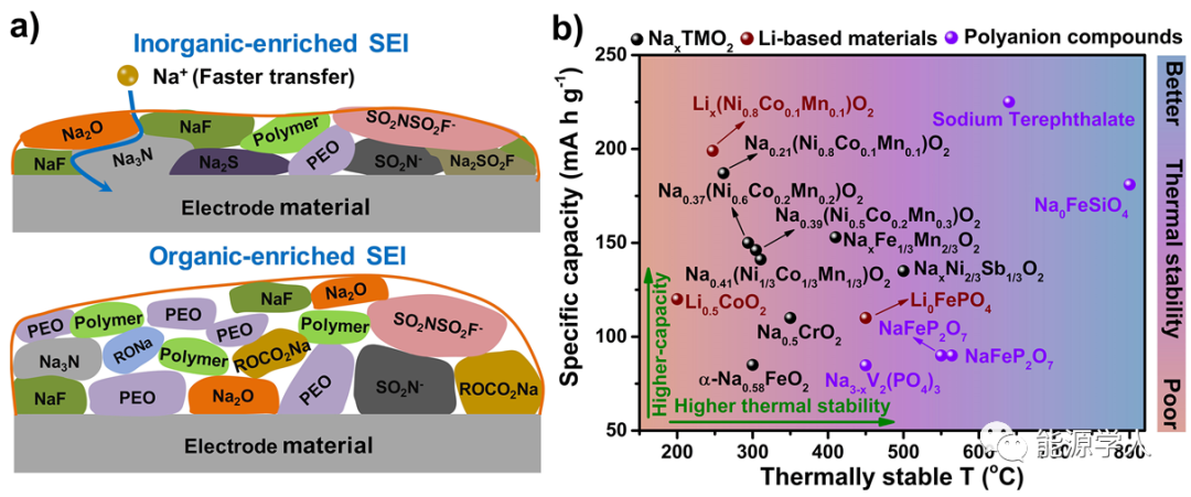 圖4 a)陽極表面無機(jī)物種富集SEI(頂部)和有機(jī)物種富集SEI的示意圖。b)各種SIBs正極材料的比容量和熱穩(wěn)定性的比較(熱穩(wěn)定性數(shù)據(jù)通過DSC測(cè)定脫鈉態(tài)材料獲得)。