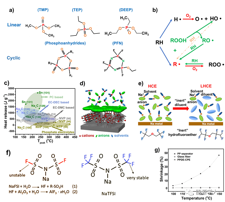 圖5 a)幾種代表性有機(jī)磷酸鹽的化學(xué)結(jié)構(gòu)。b)有機(jī)磷的阻燃機(jī)理。c)在PC-/EC-DEC-/EC-DMC電解液和磷酸鹽電解液(NTP: NaTi2(PO4)3;NVP:NaV2(PO4)3)中各種電極材料的放熱溫度和總熱量。d)陽離子在阻燃的高濃電解液中插入碳質(zhì)負(fù)極的行為。e)從HCE到LHCE的稀釋過程示意圖,以及氫氟醚的代表性化學(xué)結(jié)構(gòu)。f)NaFSI(左)和NaTFSI(右)的化學(xué)結(jié)構(gòu)。(g)聚丙烯分離器、玻璃纖維和PPDE-CPE的熱收縮率為100至150 °C。