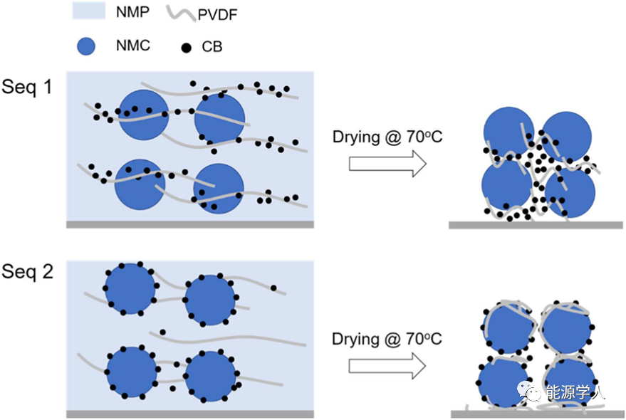 因此,順序1制成的漿料的“強度”由PVDF鏈的纏結(jié)和CB的填充效應(yīng)共同提供。順序2制成的漿料的“強度”主要由PVDF鏈的纏結(jié)提供。導致順序2制成的漿料流動性較好。在干燥過程中,使用順序1制得的漿料隨著NMP的蒸發(fā),CB納米顆粒被捕集在PVDF聚合物基質(zhì)中,形成了填充NMC顆粒之間空間的多孔CB/PVDF簇。在干燥使用順序2制得的漿料時,附著在NMC顆粒上的CB納米顆粒會吸收PVDF,從而在NMC顆粒上形成致密的CB/PVDF層。