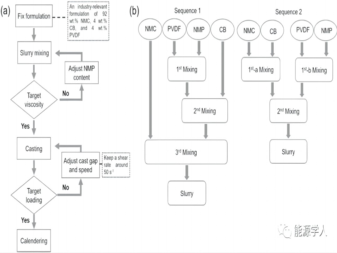 從漿料的制備工藝出發(fā),美國肯塔基州列克星敦大學(xué)和福特汽車公司研究團隊研究了兩種主流的工業(yè)混合順序?qū){料流變行為的影響,以及漿料流變與LiNi0.33Mn0.33Co0.33O2(NMC)電極的結(jié)構(gòu),機械和電化學(xué)性能之間的關(guān)系。研究發(fā)現(xiàn):1)在添加NM