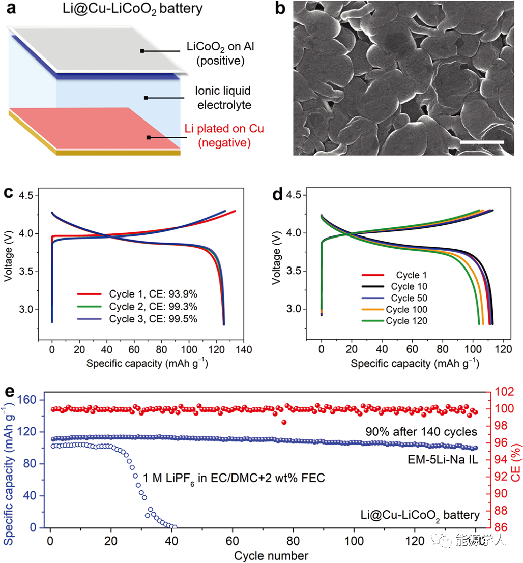 圖4 采用EM-5Li-Na IL電解液的Li@Cu-LiCoO2電池。a) Li@Cu-LiCoO2電池結(jié)構(gòu)示意圖,電池負(fù)極為沉積了一定量Li金屬的Cu箔。b)Cu表面沉積Li后(面容量:2 mAh cm?2)的表面形貌,比例尺:5 μm。c)采用 EM-5Li-Na IL電解液的Li@Cu - LiCoO2電池在0.25 C下的恒流充放電曲線。d) 采用 EM-5Li-Na IL電解液的Li@Cu-LiCoO2電池在0.7 C下的恒流充放電曲線。e)使用有機(jī)電解液和EM-5Li-Na IL電解液的Li@Cu -LiCoO2電池在0.7C下的循環(huán)穩(wěn)定性曲線。(c-e)中LiCoO2的載量為≈10 mg cm?2,所沉積Li金屬的容量約2倍過量。